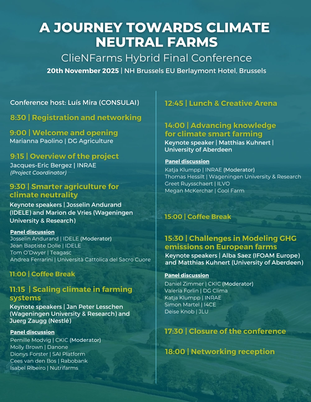 Join us at the ClieNFarms Final Conference entitled ‘A journey towards Climate Neutral Farms’ and discover practical solutions and key results from ClieNFarms project — designed to support the entire farming ecosystem (farmers, advisors, supply chain actors, policymakers and more) in the transition to climate neutrality and resilience.