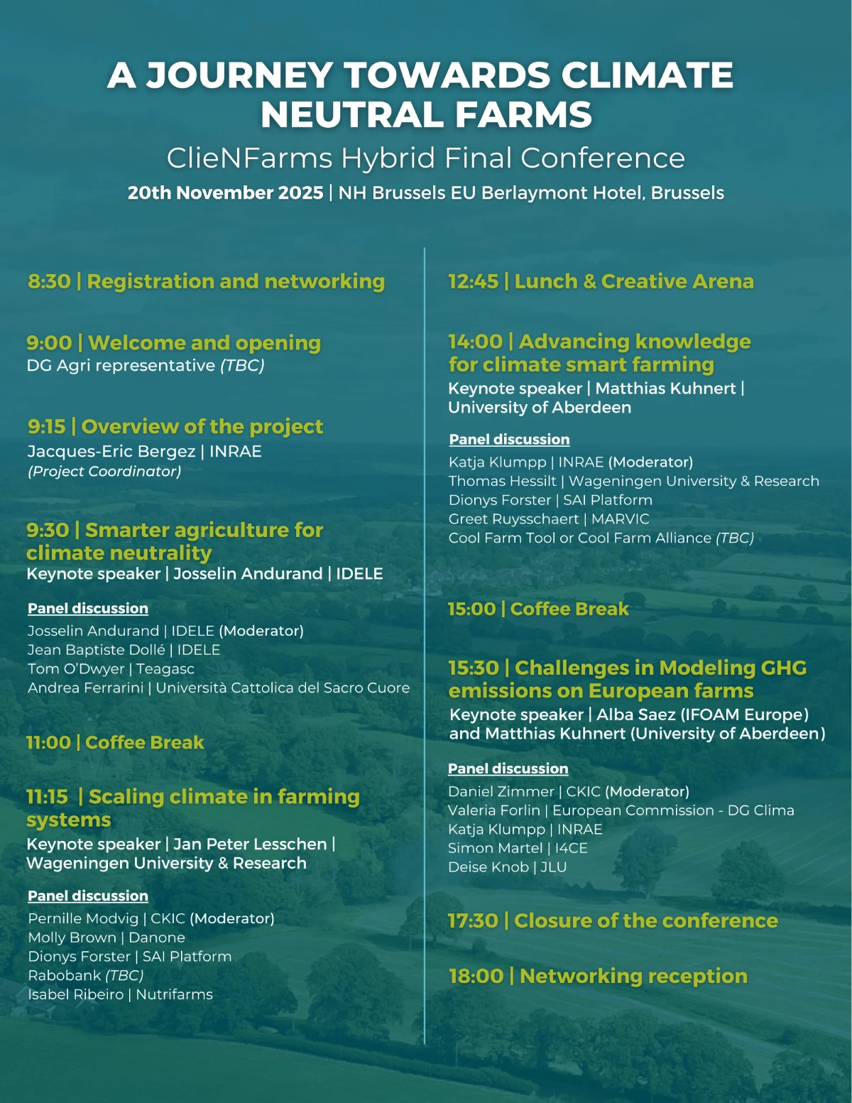 Join us at the ClieNFarms Final Conference entitled ‘A journey towards Climate Neutral Farms’ and discover practical solutions and key results from ClieNFarms project — designed to support the entire farming ecosystem (farmers, advisors, supply chain actors, policymakers and more) in the transition to climate neutrality and resilience.